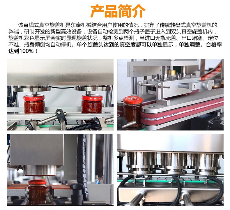該直線式真空旋蓋機(jī)是東泰機(jī)械結(jié)合用戶使用情況,摒棄了傳統(tǒng)轉(zhuǎn)盤式真空旋蓋機(jī)的弊端,研制開發(fā)的新型高效設(shè)備,設(shè)備自動(dòng)檢測(cè)到兩個(gè)瓶子蓋子進(jìn)入到雙頭真空旋蓋機(jī)內(nèi),旋蓋機(jī)彩色顯示屏?xí)?shí)時(shí)顯示旋蓋狀況,整機(jī)多點(diǎn)檢測(cè),當(dāng)進(jìn)口無瓶無蓋、出口堵塞、定位不準(zhǔn)、瓶身傾倒均自動(dòng)停機(jī)。單個(gè)旋蓋頭達(dá)到的真空度都可以單獨(dú)顯示,單獨(dú)調(diào)整。合格